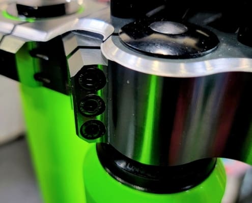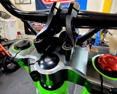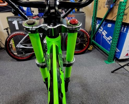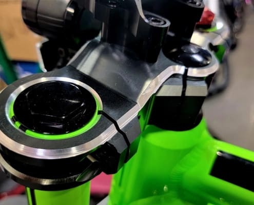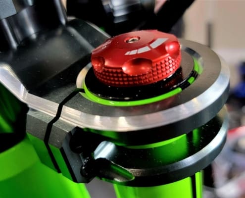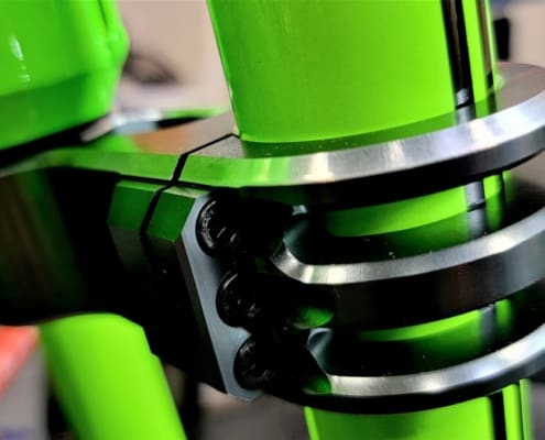 BILLET SS F1 BILLET TRIPLE CLAMPS – INVERTED MTB FRONT SUSPENSION FORKS WITH BLACK SLEEVES, THROUGH AXLE HUB AND FORK PROTECTORS.