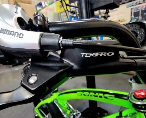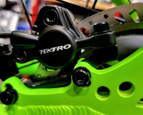 Tektro hydraulics disc brakes, 180mm Front Rotor / rear Rotor, Motor Inhibitors, 2-Finger Levers with Adjustable Reach.