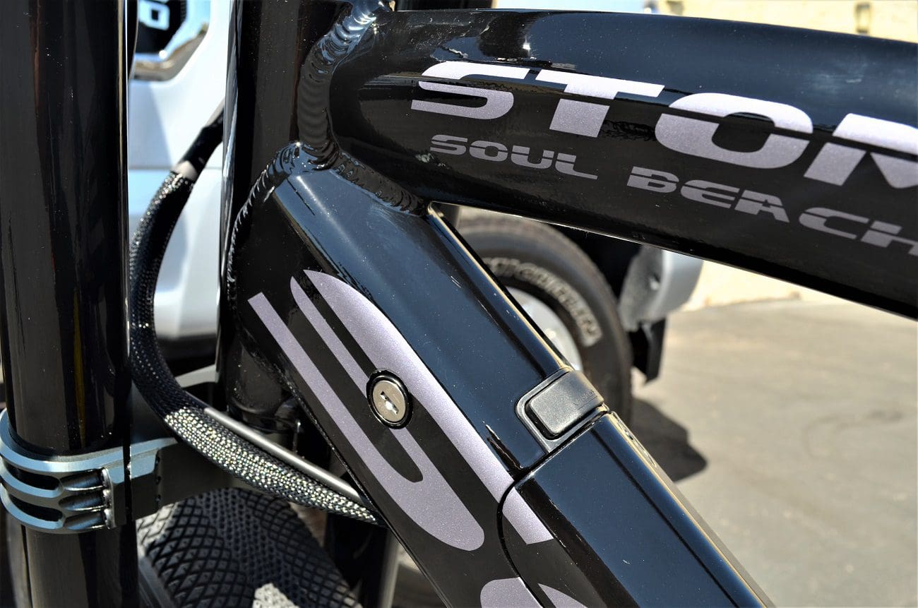 BMX inspired, hand-welded T6-6061 aluminum frame featuring oversized tubing, CNC support gussets, and the integrated locking down tube LG battery.