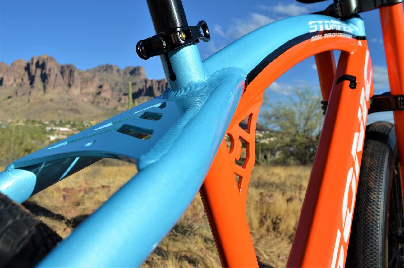 BMX inspired, hand-welded T6-6061 aluminum frame featuring oversized tubing, CNC support gussets, and the integrated locking down tube LG battery.