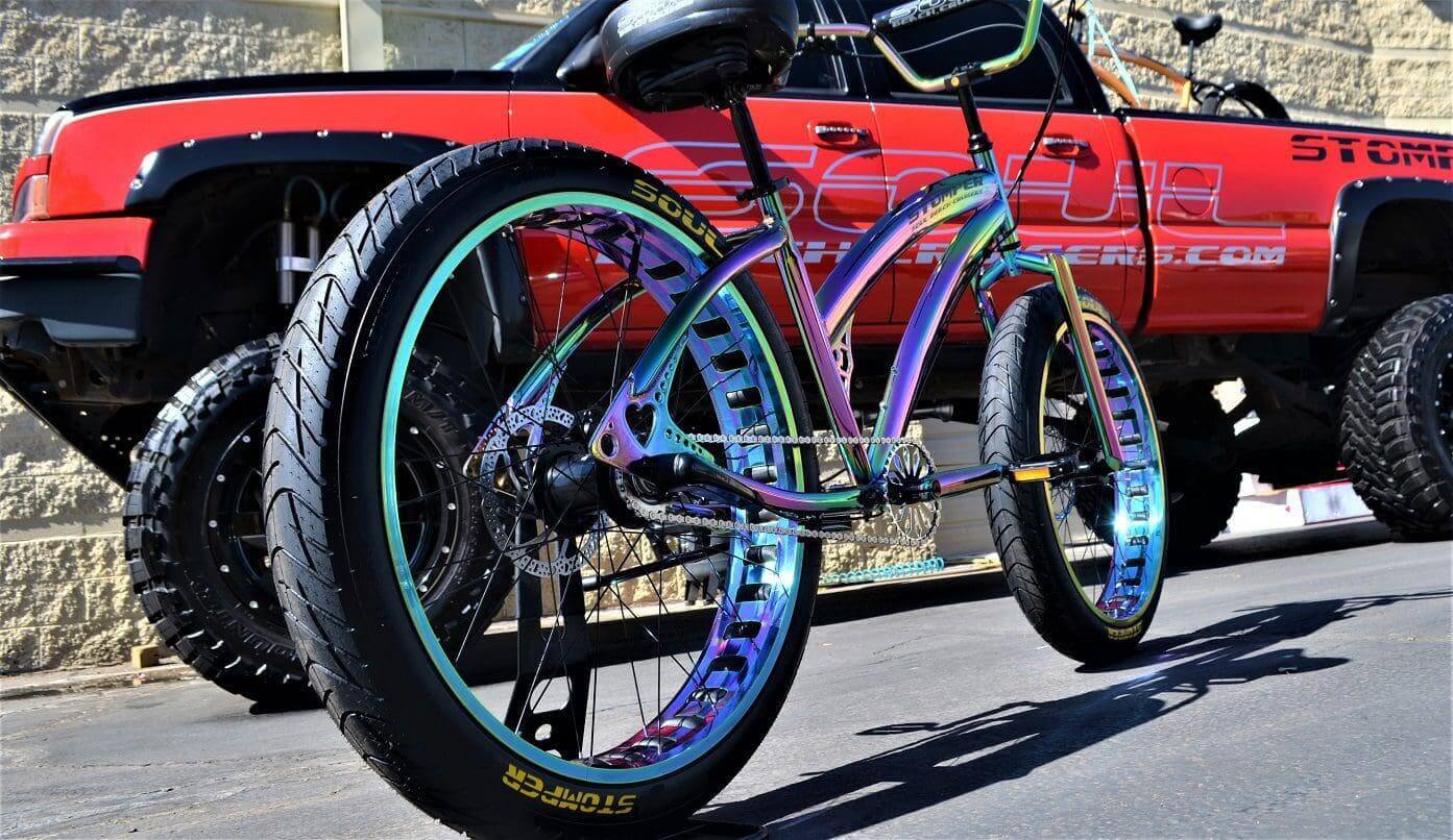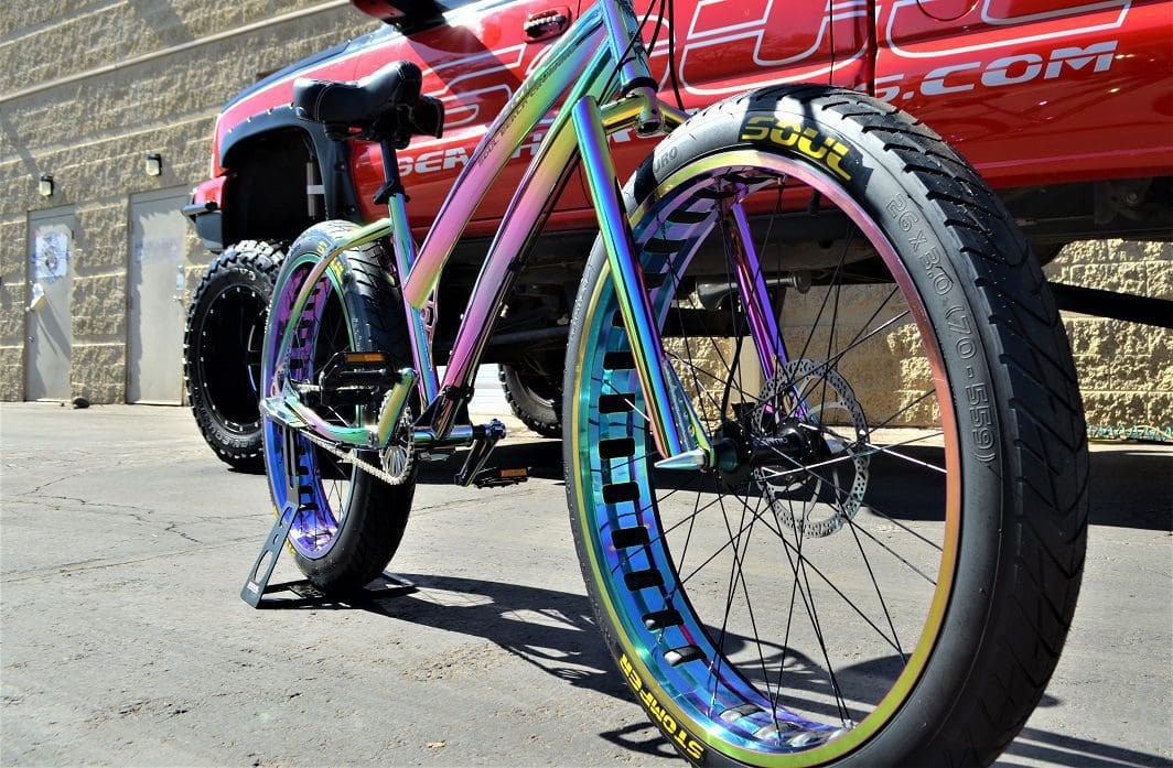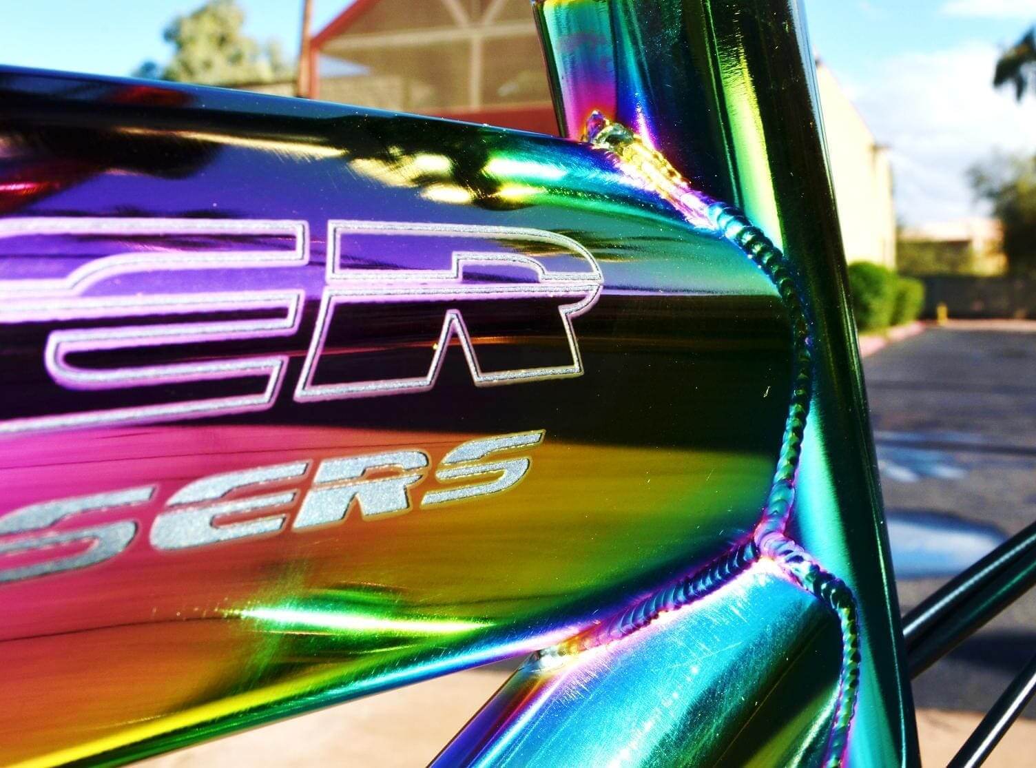 This chrome based bike has a special coating the presents an “oil slick” like look that makes every one unique.  Unfortunately, this bike doesn’t have fenders because we can not make the fenders with this coating.  No touch up either. What you get is the most eye catching bike on the planet!